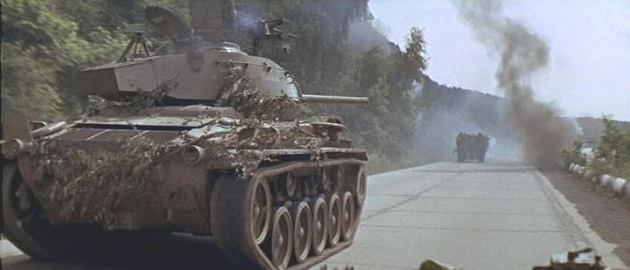 One US vehicle column was shot on film as it raced to the bridge used in the movie to simulate the Rhine bridge capture. The movie column ran head-on into a column of very contemporary T-54 and T-55 tanks coming from the opposite direction. The Soviet tank crews were stunned to suddenly see the US Army in front of them and were about to engage the American column. Negotiations began which lasted for several hours. After some time, the invading Soviets finally understood they were facing actors filming a movie and not the expected imperialist cutthroats and moved pass the American movie column.