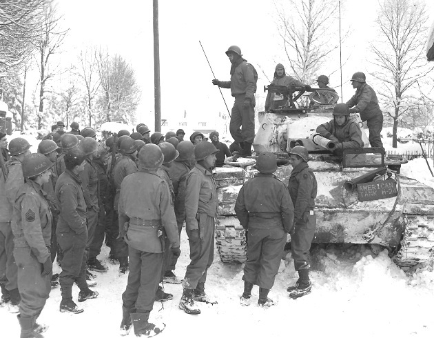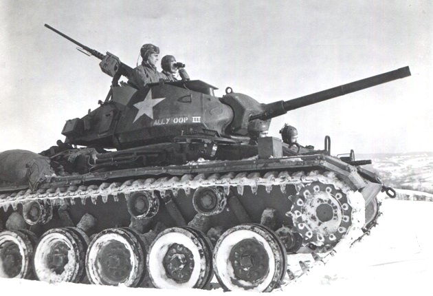 On 14 January 1945 during the advance into Germany, the crew of M24 named “Ally Oop III” pauses and scans ahead for any enemy activity. The dark Olive Drab paint and white stars made the M24 highly visible against the surrounding snow covered terrain.