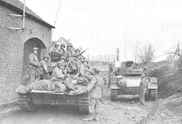 These two M24s of F Troop, 4th Cavalry Reconnaissance Squadron load up infantry for an attack outside of Broich, Germany on 2 March 1945. The Chaffee on the right has an air identification panel draped over the storage on the rear hull.