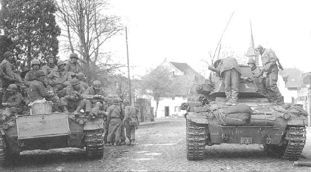 Combat Command B (CCB) of the US 8th Armored Division consisted of: 49th Armored Infantry Battalion (AIB), 36th Tank Battalion and the 399th Armored Field Artillery Battalion. CCB was detached from the division and assigned to the US 35th Infantry Division so an attack could be mounted in the direction of Rheinberg and Wesel to prevent the Germans from escaping across the Rhine River.