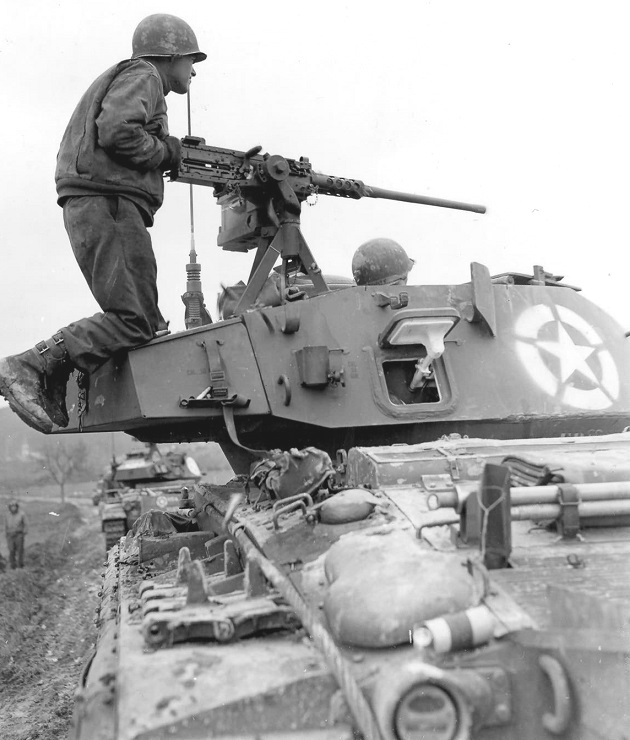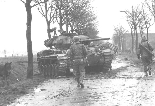 GIs of the 120th Infantry Regiment passing a M24 probably of the 744th Tank Battalion during attacks against the 116th Panzer Division. The front hull of the M24 is covered with dirt from burst sandbags indicating it had engaged the enemy.