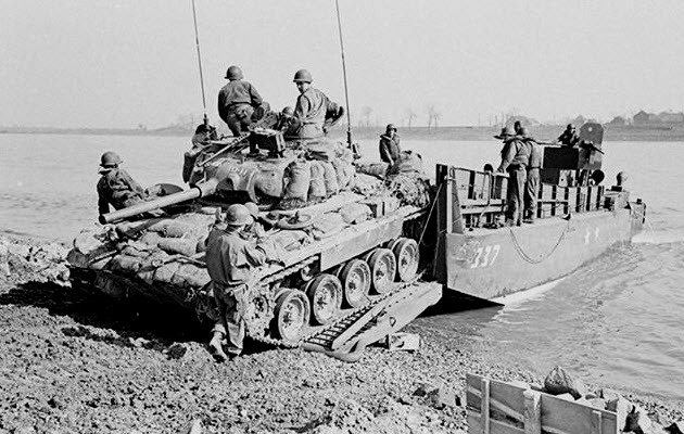 A M24 tank number 18 of Company D, 18th Tank Battalion, 8th Armored Division reversing into an LCM(3) number 337. This battalion was the first to cross the Rhine River on 24 March 1945 in the area of the 9th US Army. Note the sandbags on the front hull of the M24 and around the turret side.