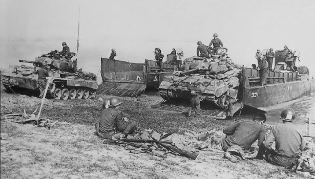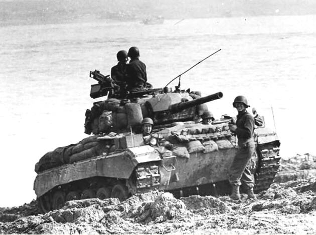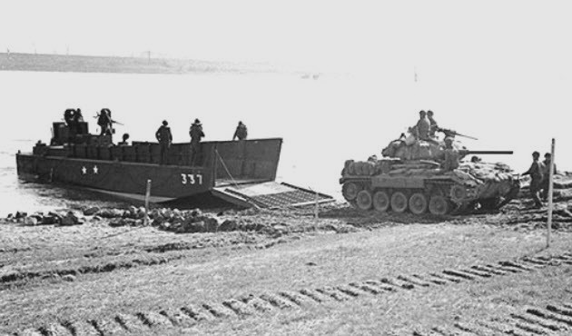This is a view of a M24 climbing up the river bank after leaving the LCM. Note the spare track on the front hull and sandbags around the hull and turret sides.