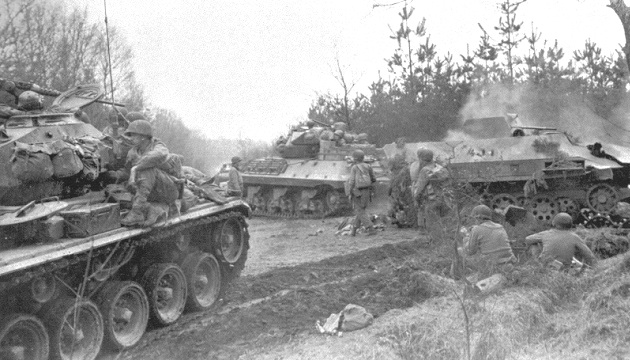 Supporting the 30th Infantry Division: a 744th Tank Battalion M24 on the left, a M10 of the 823rd Tank Destroyer Battalion in the center, and on the right is a knocked out Sd.kfz. 251/17 ausf.D, Kirchhellen, 25 March 1945.