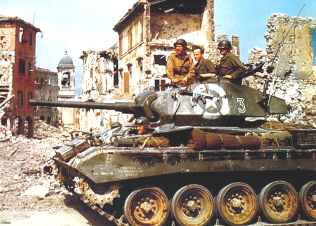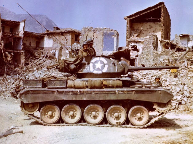 M24s of the 81st Reconnaissance Squadron, 1st Armored Division among the ruins of Vergato (southeast of Bologna), Italy on 14 April 1945.