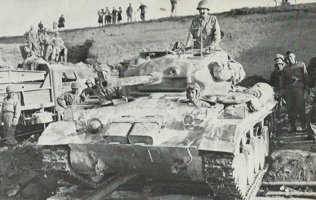 This is the same M24 disembarking from the ferry on the north bank of the river. The twin hoops protect a “donkey sight” above the commander’s sight which was used for indirect artillery fire.