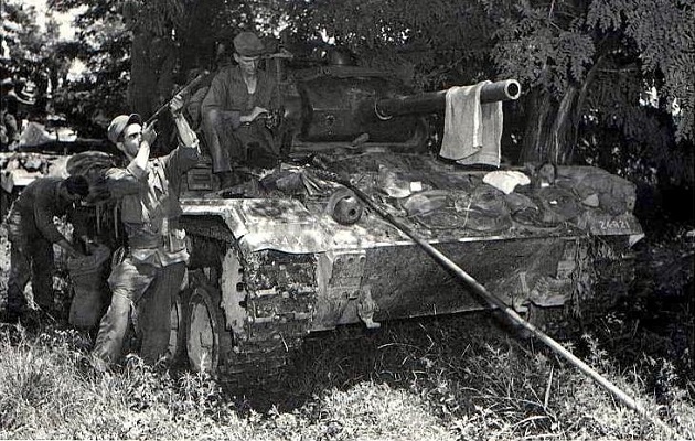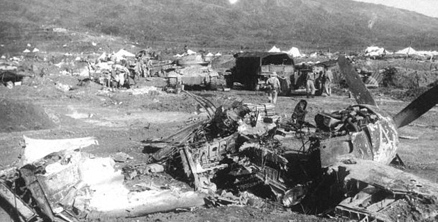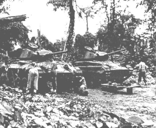 One of the M24s at the airstrip at Diên Biên Phu in May 1954. The charred remains in the foreground is one of six French Grumman F8F fighters destroyed on the ground by Viet Minh artillery fire.