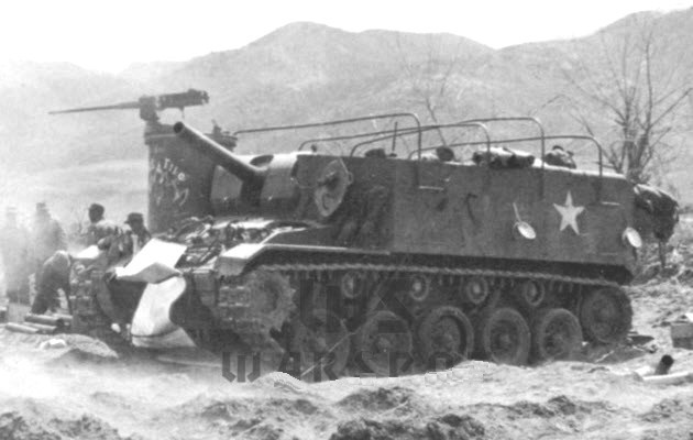 Developed in 1945. it mounted a 105mm howitzer M4 (126 rounds) was intended to replace the M7 105mm HMC Priest which was based on the Sherman chassis. 448 were ordered but only 316 were built by the end of the war. The M37 was too late to see action in WWII but it did see action with US forces during the Korean War along side the M7 Priest. The M37 was much more sluggish due to the amount of ammunition it carried (126 rounds), its recoil system, and the weight of the 105mm M4 howitzer.