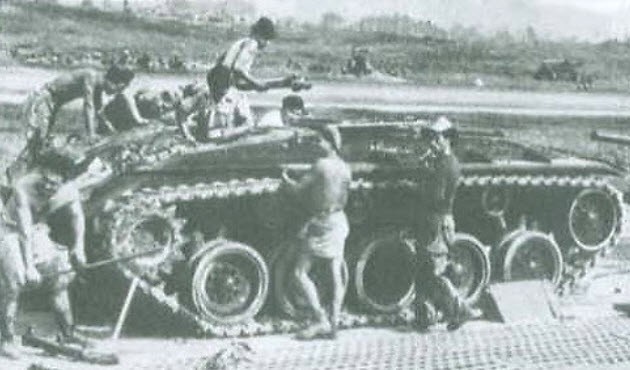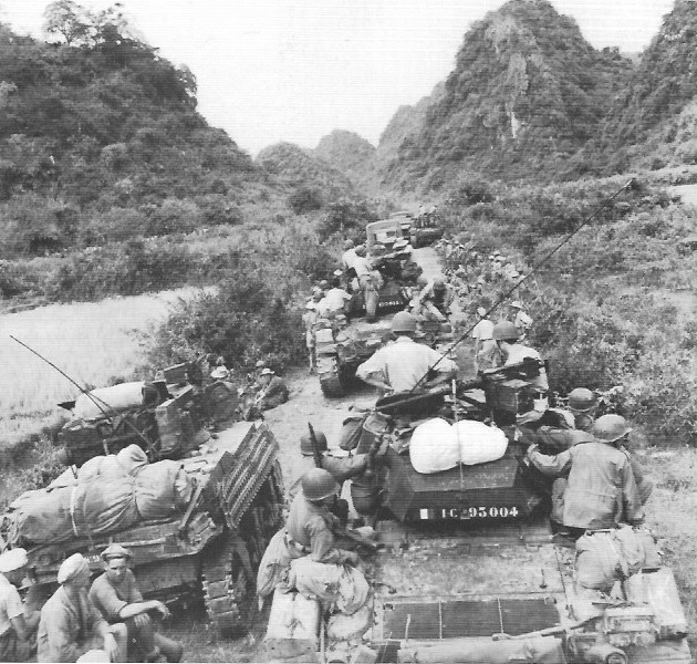 On 7 May 1954, Diên Biên Phu was over-whelmed by Viet Minh forces. Early that evening all the M24s were destroyed by the crews. Shown is the French crews surrendering to the Viet Minh troops.
