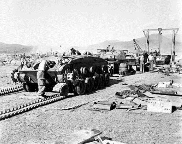 This M24 along side the road was hit and the stored gear on the engine decking had caught fire. Note the metal frame stowage rack mounted on the rear hull similar to the ones on British tanks in North Africa.