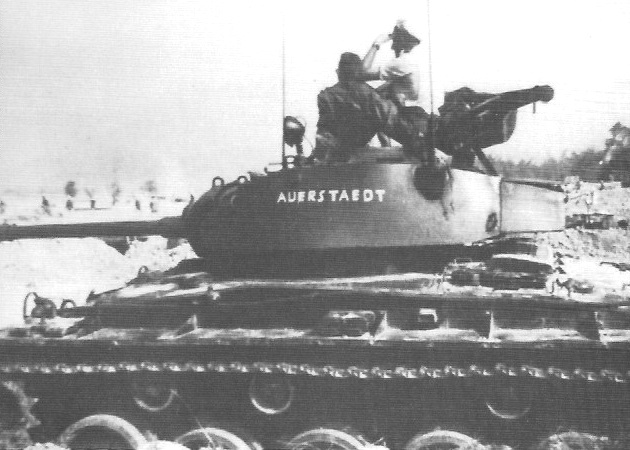 Company D, 36th Tank Battalion, 8th Armored Division, was in reserve in Aldekerk, Germany on the morning of 5 March 1945. This M24 was probably in Aldekerk waiting for orders to move northeast to Lintfort. Note the position of the serial number “USA 30119666” painted on lower edge of the turret.