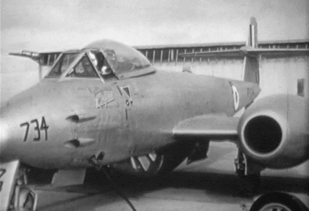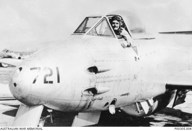 Simmonds flying A77-385 named “Chloe” was in a flight of four Meteors when they were attacked by MiGs from behind. He became aware of the attack when tracer rounds passed over his wing. His attacker then passed only a few meters below him and he was able to get on the tail of MiG and into a good firing position. He fired a long burst of 20mm and hit the MiG which then went into a diving spin. The MiG pilot bailed out and parachuted down as his smoking jet crashed to earth.