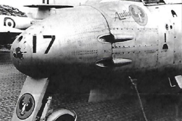 Gogerly’s assigned Meteor was A77-17 named “Audie”. The emblem is a Piping Shrike on a light blue disc which is the emblematic bird that appears on the South Australia flag. The emblem was carried beneath the windscreen and repeated on the nose gear door.