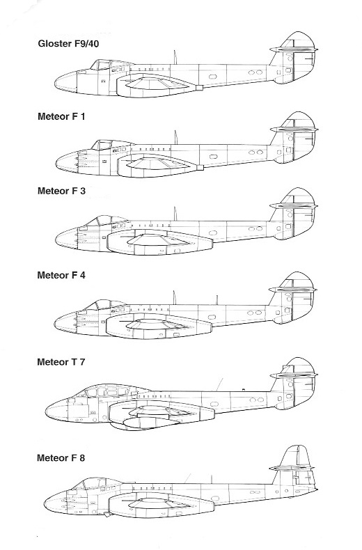 Derwent I powered, with sliding canopy and 210 were built (the first 15 were Welland-powered). It had long engine nacelles with enclosed jet pipe and short span wings. First flown on 11 September 1944. Serial Numbers were: EE230 to EE254, EE269 to EE318, EE331 to EE369, EE384 to EE429, EE444 to EE493