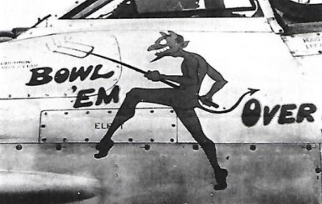 The devil with a red-hot pitch fork was a theme that appeared several times in the 1950s and 1960s on diverse RAAF aircraft. The term “Bowl ’em Over” is a term from the game Cricket, a well-aimed delivery to hit the wicket, the set of three stumps with two balls across the top at either end of the pitch, defended by a batsman.