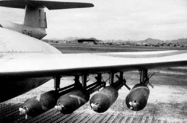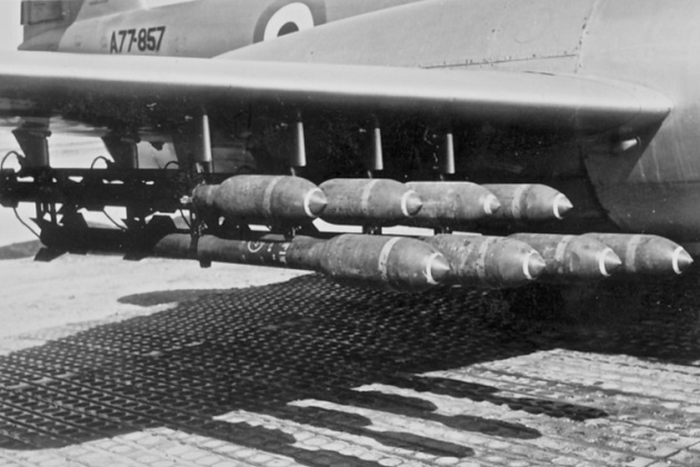 Besides carrying the RP-3 60 lbs rockets, the Meteor F 8 was capable of carrying two 1,000 lbs (453 KG) GP bombs. They were used against larger enemy targets such as bridges, tunnels and dams.