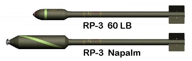 The normal rocket load for the Meteor was eight RP-3 3 inch 60 lbs (27.22kg) SAP rockets but many Meteors were modified to carry a double tier load of 16 60 lbs rockets.