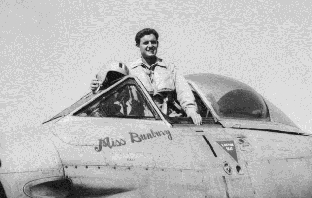 Simmonds in the cockpit of his assigned Meteor A77-744 named “Miss Bunbury.”