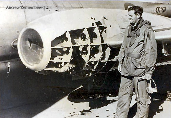 In this photo, Ken is inspecting the battle damage on A77-207 named “Bowl ’em Over.” The damaged engine was replaced and A77-207 did survive the war.