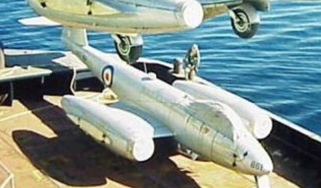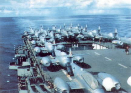 Meteor jets heading for Korea are lined up on the flight deck of the HMS Unicorn in Singapore in 1952. The aircraft were flown from the UK. Note the auxiliary fuel tanks mounted under the wings.