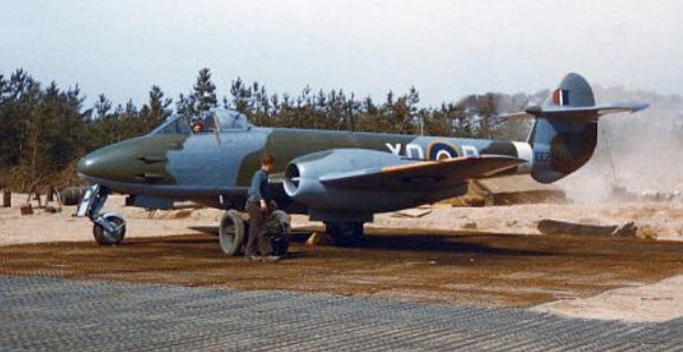 Meteor F.1 (serial EE227) of the 616 Squadron on the PSP ramp at RAF Manston, Kent on 4 January 1945. After squadron service, EE227 was transferred to the Royal Aircraft Establishment (RAE) for experimental modifications becoming the only T-tailed Meteor and later became the world’s first turboprop aircraft.