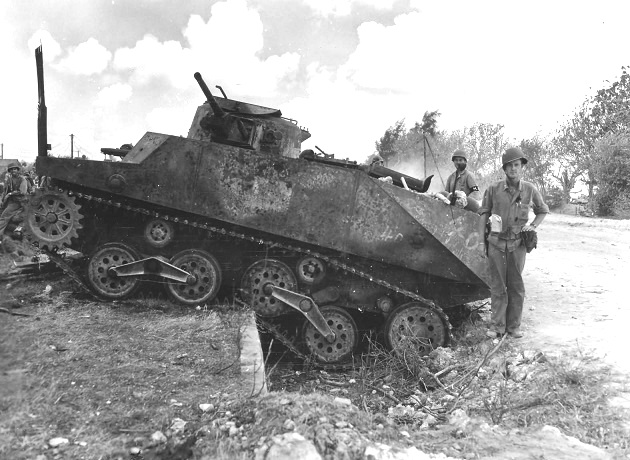 M8 75mm howitzer motor carriages (HMC) were assigned to the Headquarters companies in US Army medium tank battalions. Six M8s were assigned to the 762nd Tank Battalion on Saipan. Based on the M5 light tank chassis, the short barrel 75mm howitzer was mounted in an open top turret and it provided fire support to the infantry and other units in the battalion.