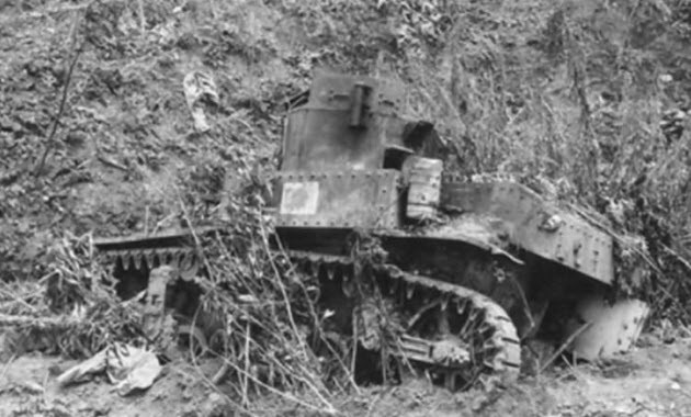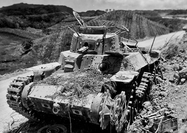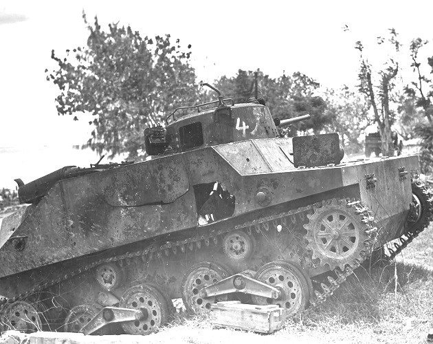 US forces found this abandoned early M3 Stuart tank on Saipan which the Japanese captured during the fall of the Philippines in 1942. The lower rear hull engine hatch is open indicating some engine problem. Note the Japanese flag on the hull side.