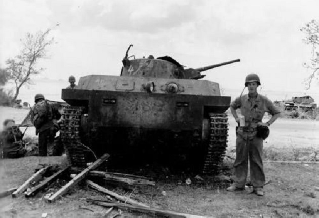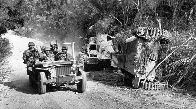 A jeep carrying marines drive pass two knocked out Japanese Type 95 Ha-Go tanks. One of the tanks is on its side. To the right of the Jeep driver is the flexible exhaust pipe of the Deep Water Fording Kit WV-6.
