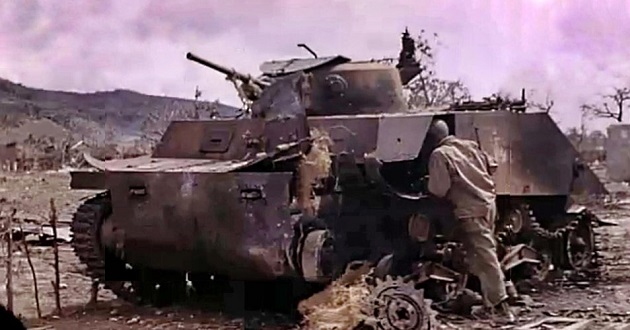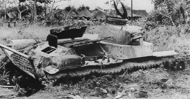 This Type 97 Chi-ha medium tank of the 5th Company, 9th Tank Regiment, survived the night attack and was later knocked out probably by M5A1(s) of the 762nd Tank Battalion. Note that the 57mm gun is missing which might indicate that it was a command tank.