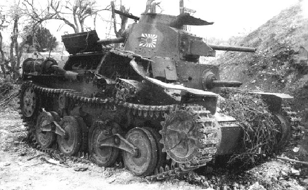 This is a Type 97 Chi-ha medium tank of the 5th company, 9th Tank Regiment and behind it is a Type 95 Ha-go light tank. Note the numerous hits from armor piercing rounds on both tanks.