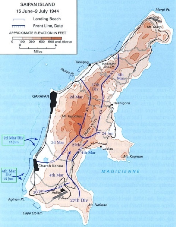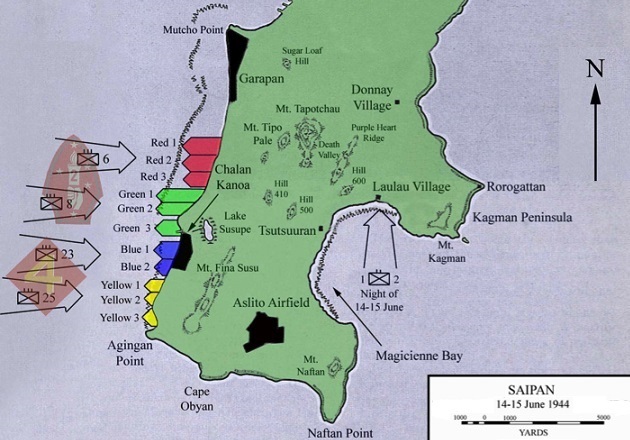 On June 24, the main objectives were Mount Tapotchan, Death Valley, Purple Heart Ridge, and the Kagman Peninsula. The 2nd Marine Division attacked towards Garapan and repelled two Japanese counterattacks. In an unequal armor duel near Garapan, M4A2 tanks of Company C, 2nd Marine Tank battalion engaged 7 Japanese tanks where only one Japanese tank managed to escape.