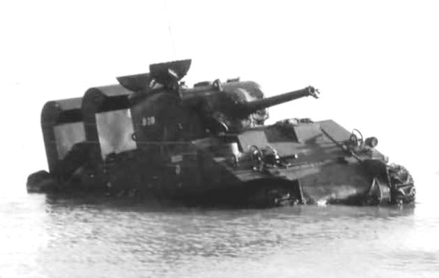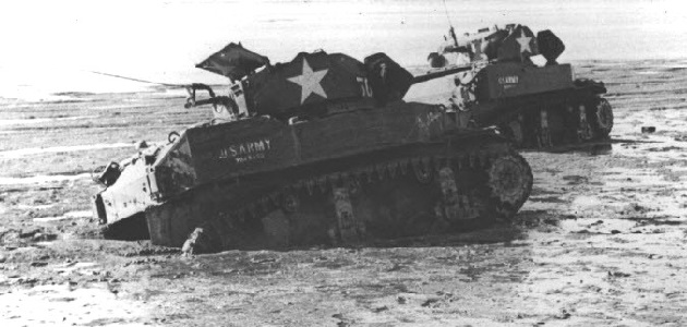 These two late M5A1 Stuart tanks from Company D of either the 762nd Tank Battalion are stuck in the sand on Blue Beach 1 at low tide. Note the white stars on the turrets and above the serial number on the rear hull side is “US ARMY”.