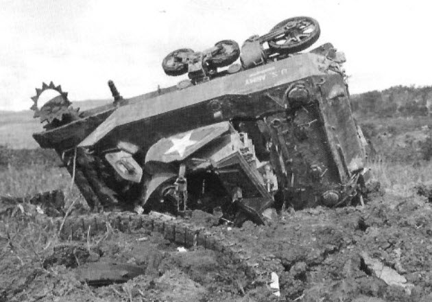 One of the most deadly enemies of US tanks were mines. The Japanese occasionally buried aerial bombs with the mines along likely tank routes. The blast from such a mine has blown off the front right bogie, ripped apart the drive sprocket, and flipped the tank onto its side.