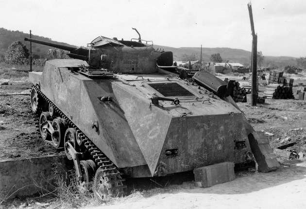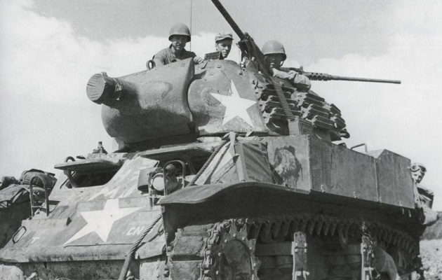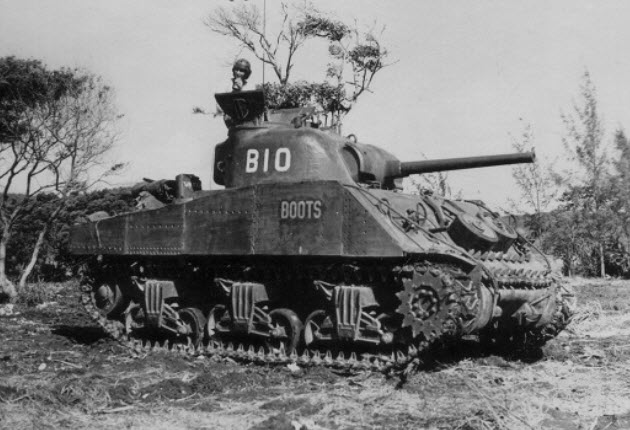 Sources incorrectly captioned this Sherman as being a Marine M4A2 but it is clearly a composite hull M4 Sherman. It was named “Last Chance” and belonged to Company B, US Army 762nd Tank battalion. The composite hull M4 was similar to the basic M4 medium tank, but the front hull was a single casting instead of being constructed of the usual welded armor plates.
