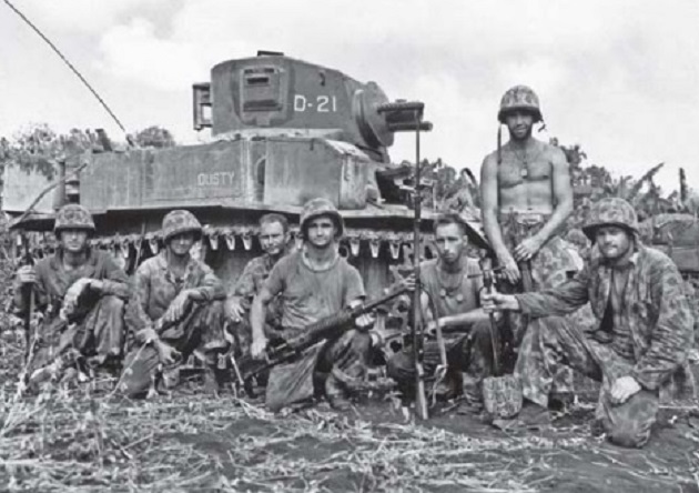 M3A1 Satan D-21 ‘DUSTY’ of Company D, 2nd Marine Tank Battalion was commanded by 1st Lieutenant Alfred Zavda (second from left). The crew is posed with other marines and are displaying captured Japanese weapons, a Type 92 heavy machine gun and a rifle.