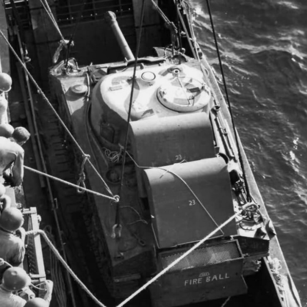 M4A2 “FIRE BALL” number 23 of the 4th Marine Tank Battalion is being lowered into a landing craft, mechanized (LCM) in preparation for the invasion. This battalion adopted the practice of painting the turret roof white with large red numbers as an aerial identification aid. Note the wading stack sections are not connected, but tied down to reduce the height while on board the transport ship. Once in the LCM, the crew would attach the wading stack sections during the run to the landing beach.