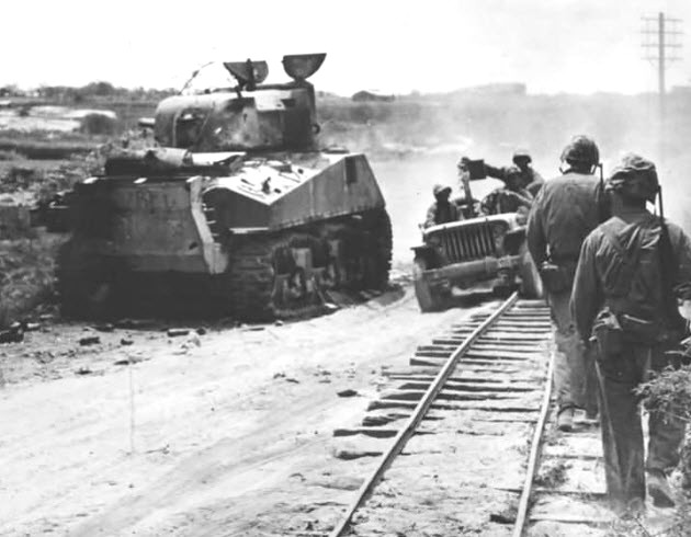 Marines are passing a knocked out M4A2 tank. Before the war on Saipan, the Japanese used the narrow gauge railroad tracks for transporting sugarcane, during the war they were used for transporting troops, ammunition and supplies.