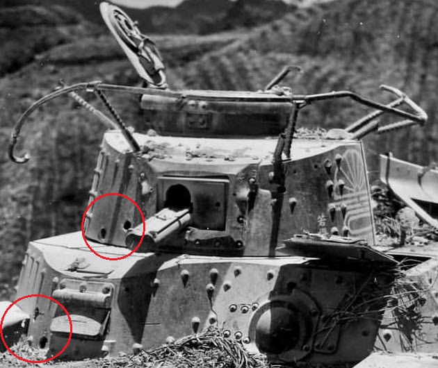 This Type 95 Ha-go tank of the 4th company, 9th Tank Regiment was knocked out during the fighting near Red Beach 3 on the early morning of June 16. This tank appears to have been hit by an anti-tank round on the upper edge of the sponson which not only penetrated the tank, but cracked its armor.