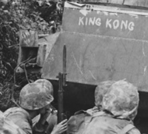 This is my close up of the rear hull of “KING KONG”. To the left of the wading trunk is a field fabricated telephone box which allowed the accompanying marines to communication with the crew of tank.