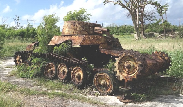 This rusting Type 97 Chi-Ha tank is the Imperial Japanese Army Medium Tank Historical landmark located northeast of the Saipan International Airport. Note that shrubs and bushes are growing inside the tank.