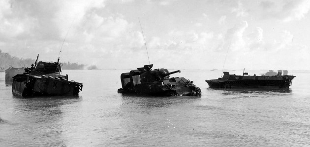 A Marine M4A2 tank and two LVT Amtracs knocked out in the surf. On the right is a LVT-4 with a silhouette of another tank behind it. On the left is a LVT(A)-4 armed with a 75mm howitzer mounted in an open top turret.