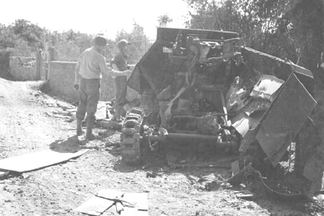 Das Reich Panzer Grenadier attack columns were led by Sd.Kfz.251/9 Schützenpanzerwagens. This SPG variant, also called “kanonenwagen”, was equipped with a short-barrel 75mm (2.95 in) KwK 37 L/24 howitzer which used the same mounting as on the StuG III. It was nicknamed “Stummel” (Stump). Its armor was adequate to stop small arms fire but US anti-tank gun fire completely destroyed the vehicle as seen here.