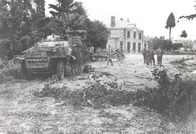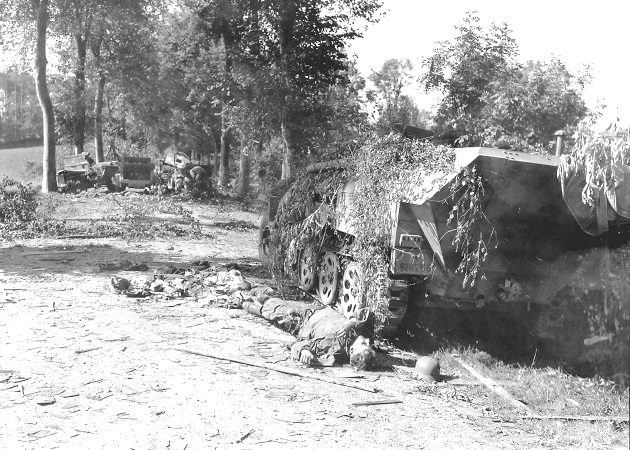 This Leibstandarte Sd.Kfz. 251 Ausf. D halftrack and VW Schwimmwagen were knocked out somewhere between Juvigny-le-Tertre and St. Barthélemy.