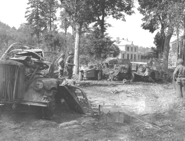 A GI is examining this knocked out Jeep and M3 Half-track (lying on its side) on Grande Rue in Mortain. They probably belonged to the the 823rd Tank Destroyer Battalion. M3 Half-tracks were used to tow the M5 3-inch AT guns.