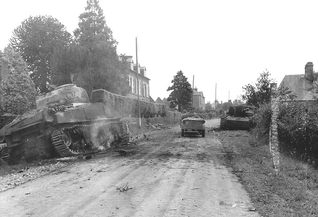 Entering the west end of Juvigny-Le Tertre along the main road, a US jeep drive pass a knocked out M4 Sherman on the left which was part of Task Force 2 (TF 2) of CCB, 3rd Armored Division. On the right side of the road is a Sturmgeshutz (Stug III) of the 1st SS Panzer-Division. Further up the road and pass the main intersection, the jeep would had passed the 32nd Armored Regiment M4 Sherman which was knocked out the week before.