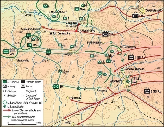 The US 30th Infantry Division “Old Hictory” was ordered to Mortain to relieve the US 1st Infantry Division. The division began arriving in Mortain on August 6, the day before the German counter-attack. The 117th infantry Regiment deployed in the vicinity around and in St. Barthelemy. The 120th infantry deployed in and around Mortain with two companies of 2/120th Infantry on Hill 314 east of the town and 1/120th Infantry on Hill 285 west of the town. The 120th Infantry were able to use the trenches dug by the 18th Infantry a few days before. The 119th infantry and 3rd Armored Division Combat Command B (CCB) were in reserve northwest of Juvigny-le-Tertre. Elements of US 4th and 9th Infantry Divisions were located on the left flank, north of the Sees River.