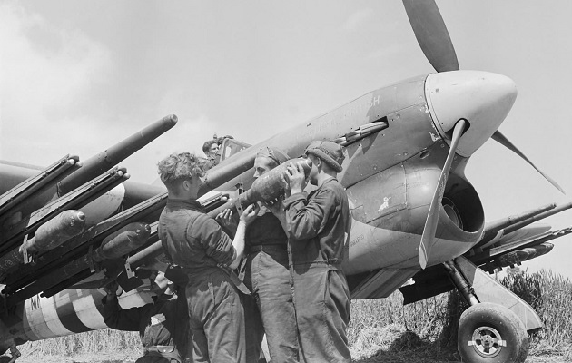 The Hawker Typhoon Ib (Tiffy in RAF slang) was armed with four 20mm cannnons and eight RP-3 60-lb rockets on launching rails. This Typhoon of the RAF 247 Squadron, serial MN317, coded ZY-B and named “China British” is being reloaded at B2/Bazenville, Normandy.