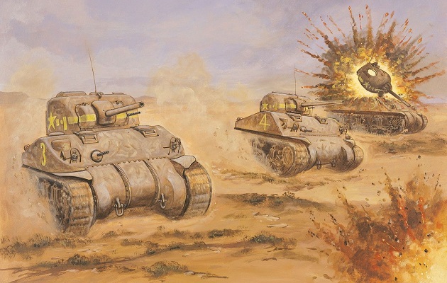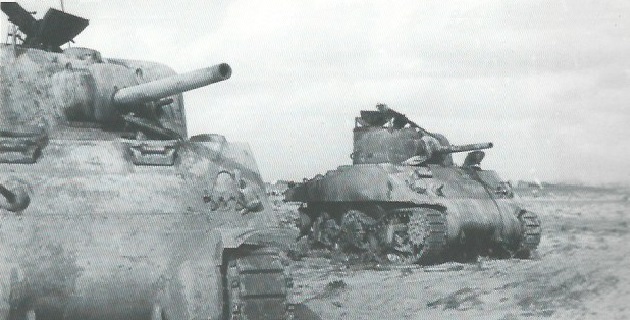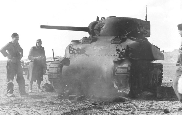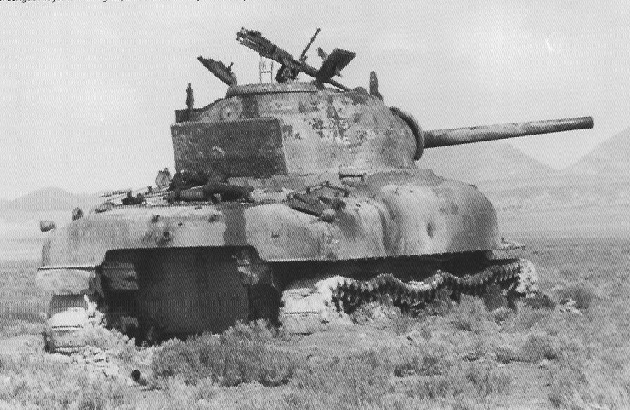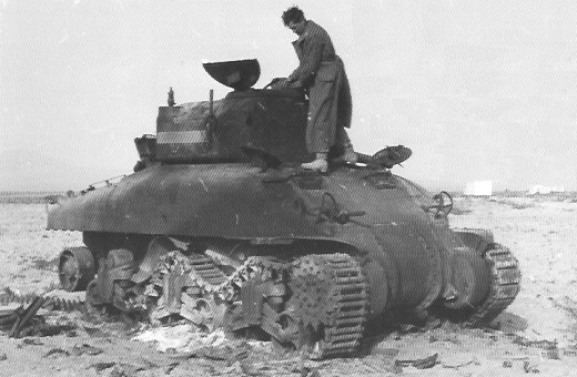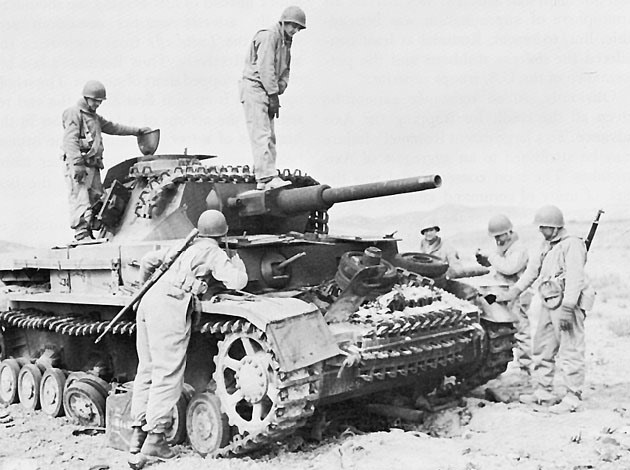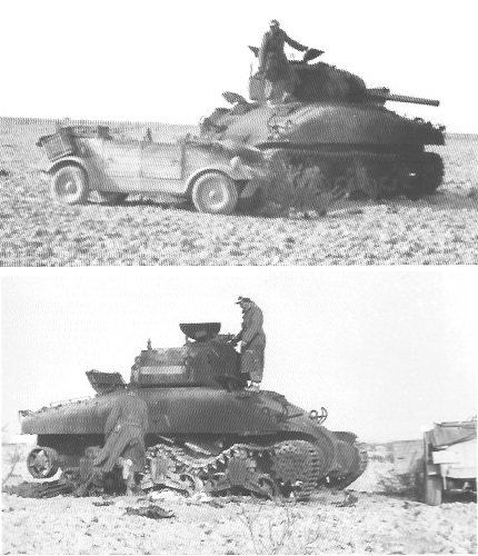 This M4A1 of 3/1st Armored Regiment was disabled on February 14. The heavy overcoats worn by the two Germans indicate that the North African nights were fairly cold compared to the hot days.