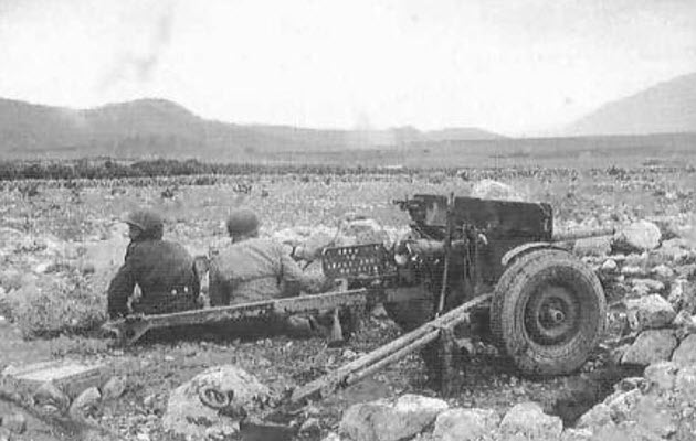 A US infantry anti-tank squad sitting by their M3 37mm anti-tank gun.