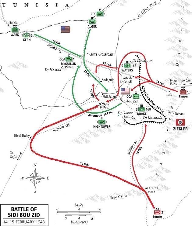 At noon as the lead tanks began to move out, their assembly area came under attack by Stukas dive-bombers which did almost no damage but were able to report CCC’s exact strength and position to General Heinz Ziegler, acting commander of the 5th Panzer Army. A truck radio near Hains’ command post blared out “The Stars and Stripes Forever” as the tanks, half-tracks, and self-propelled artillery headed towards Sidi Bou Zid.